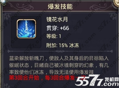 第3回合开始,每3回合爆发一次,造成同一排的贯穿伤害,伤害值+66,值得注意的是有15%的几率能够对敌人造成冰冻效果。
