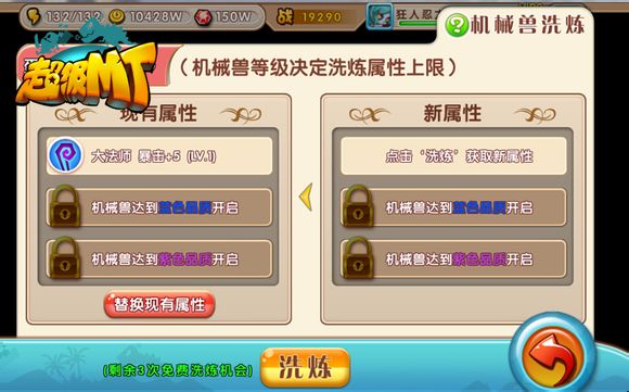 2、洗炼:出战的机械兽会对全队附加血量、闪避、破防等各种属性加成。洗炼便是选择你想要保留的加成属性,白色品质的机械兽只能提供1项属性加成,蓝色提供2项,紫色提供3项。