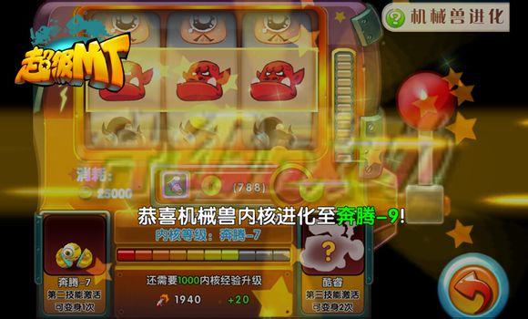 3、进化:分为赛扬、奔腾、酷睿3个阶段,每个阶段有9级。每达到一个阶段,便会让机械兽学会新的变身技能,每次变身攻击数量也会+1(1级1道激光,2级2道,3级3道……)。需使用【内核零件】和一定金币进行升级,采用老虎机的摇奖方式,首先下注使用多少内核零件进行摇奖,然后拉动摇杆即可,得到3个一样头像便会成倍增加经验值,甚至可以直接借进阶到下一个阶段。
