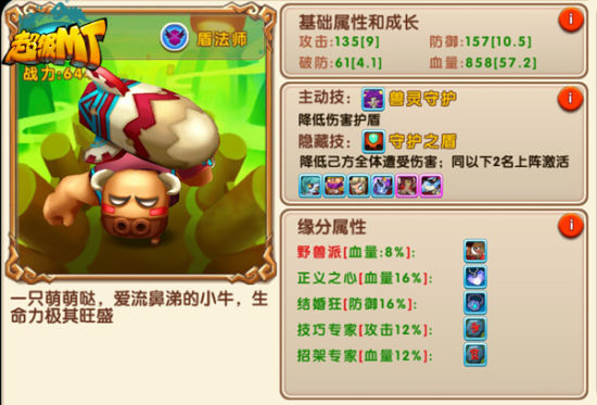 此阵容主要由老牛、熊猫人法师和夜精灵法师构成,三人均为法师类职业,盾法师老牛,熊猫人法师及夜精灵法师均是大法师职业。盾法师主要以防御为主,是阵容前排的首选,而大法师在团队中主要担当DPS。该团队的三个英雄一起上阵可以激活两组技能缘分。激活甜蜜全垒打,可使熊猫人法师对单体造成250%法术伤害,而老牛的守护之盾:可使己方全体降低60%所遭受的伤害,持续20秒。