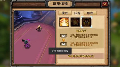 英雄技能界面:展示英雄拥有的技能界面,显示出英雄技能的效果,以及技能升级功能。英雄想获得更多的技能需要不断的提升英雄进阶等级。
