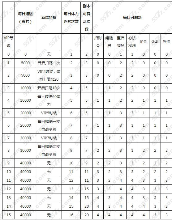 可重复购买15次体力,还额外赠送120体力,每天比非VIP可以多获得1680点体力,同时还可以额外获得招财令、经验房、宝石猎场、心法秘境、论剑、挑战等副本的多次挑战机会,获得极品心法的机会也得到极大提升。