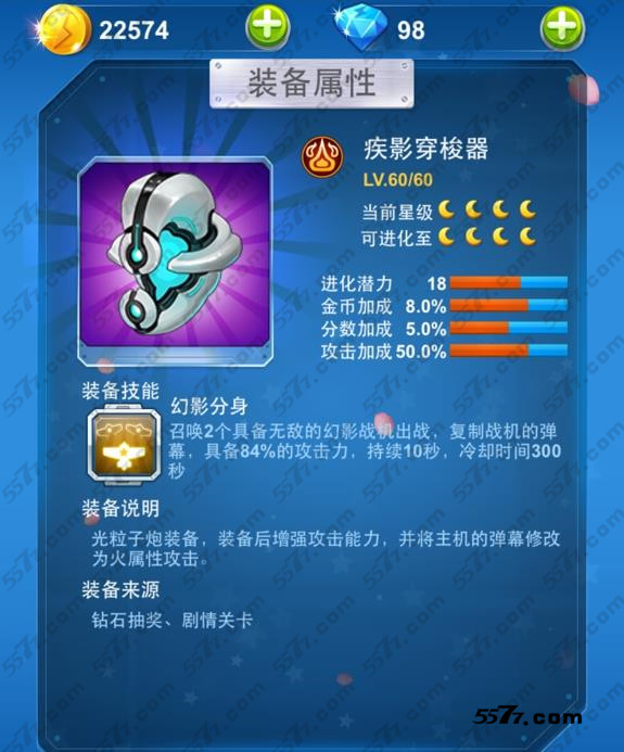 装备技能:【幻影分身】召唤2个具备无敌的幻影战机出战,复制战机的弹幕,具备84%的攻击力,持续10秒,冷却时间300秒