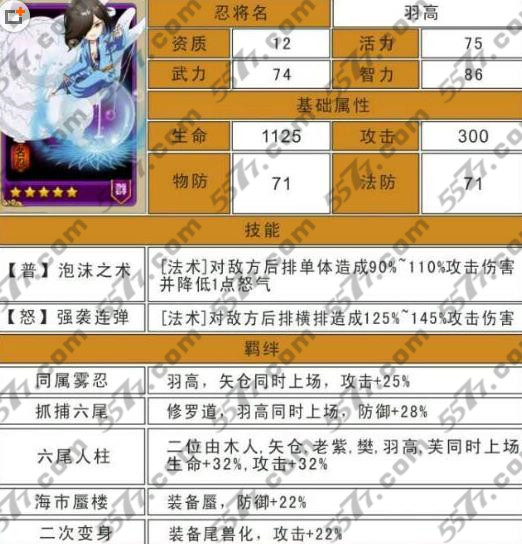 忍者百分百中的5星紫卡羽高玩家们应该有所了解的吧,但是玩家们肯定不知道这个忍将值不值得培养吧。下面小编给大家带来的是羽高的属性技能。知道这个就可以知道羽高值不值得培养了!