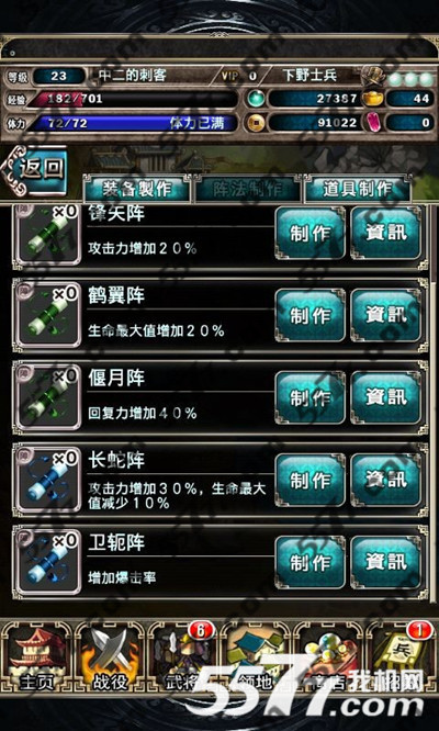在队伍编成中,可以选择这一句战斗要使用的阵法,不同的阵法会有不同的属性加成,根据自己阵容人员的属性,选择相应的阵法是重中之重,但要注意的是,阵法是作为道具使用的,只能在当局使用一次阵法,用一次数量就减少一个,所以合理地利用阵法是轻松过关的必要因素。
