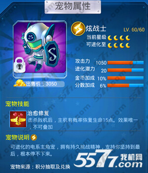 炫战士的技能为击杀敌机后,主机有概率恢复生命8点!所以它为辅助型回血的宠物,那么搭配跳跳偶等其它回血宠物,战斗回血效果还是很不错的!