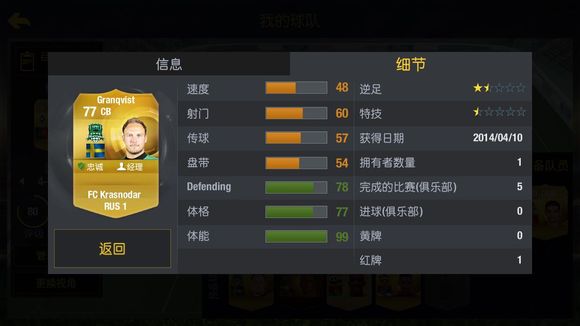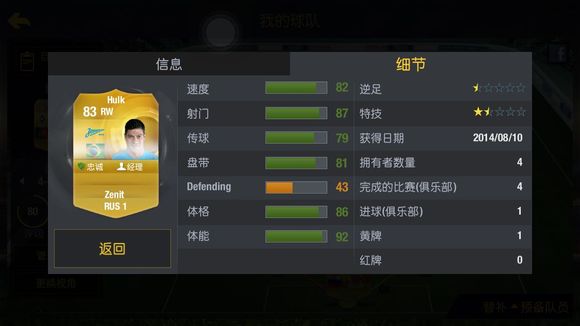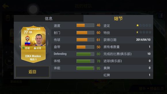 这个怎么说呢,虽然是个黑卡,但是各方面比较平庸,特别是76的盘带,有时候对于前锋盘带很重要,我用这个人基本只能一脚出球,稍微带一下就被断了