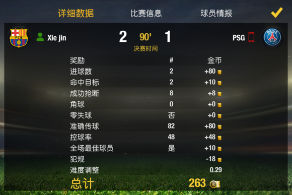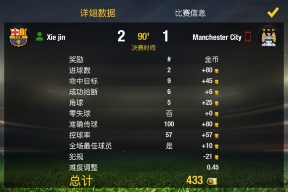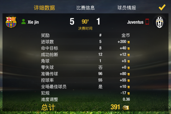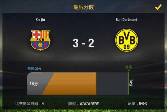 第六场大多特啊,这关要注意的是,上半场比分是1:1,下半场如果对面在50分进球比分2:1的话,我们这边会在71分跟87分进球,最终3:2,。(当初我自己以为是2:2平差点强退)如果对面在50分未进球基本就可以强退重来了。