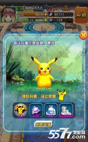 1、玩家可以通过点击游戏界面右上方的“充值”选项进行充值,新建角色首次充值任意金额钻石,即可获得五星皮卡丘,三倍充值返还,用于补充体力的牛奶*2,5万银币的丰富奖励。