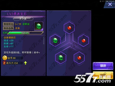 宝石升级:低级宝石可以让高级宝石吞噬升级后以“LV”表示,宝石等级越高,镶嵌后附加的属性越多、越好。
