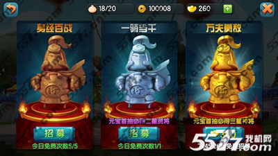 3、万夫莫敌可以招募到2,3星将魂和1,2,3星武将,每72小时可以得到一次免费招募机会,免费次数用完后可以使用300元宝继续招募