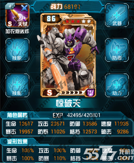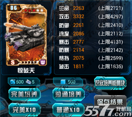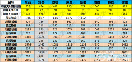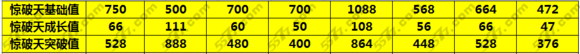 1、惊破天的相关基础数值(顺序依次为生命、攻击、防御、速度、暴击、防爆、格挡、破击;下同):