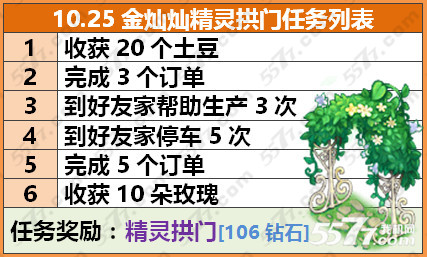 全民小镇10月25日增加金灿灿精灵拱门任务,那么玩家要怎么完成这个任务呢?任务列表有哪些?下面小编就为大家介绍一下全民小镇金灿灿精灵拱门任务攻略。