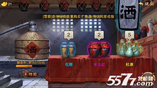 玩家都知道美酒除了购买以外,还可以通过一段时间的酿造得到。美酒酿造满之后,就不会再继续酿造。美酒酿造上限是18瓶。通过点击可以得到美酒,系统会随机得到杜康,花雕,女儿红。玩家如果想得到的是杜康,下面技巧必看: