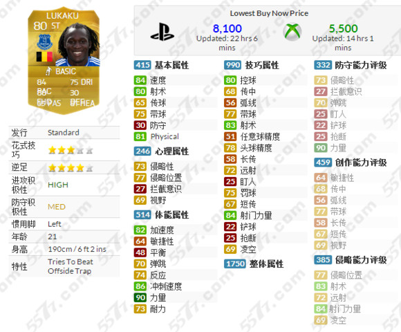 fifa15卢卡库怎么样?貌似从目前的数据表中来看,没有特别过人之处,但是总体来说各方面都比较平衡,之中又带有亮点,下面就来一起欣赏一下吧!