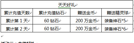 活动内容:活动期间,玩家每天充值6元,即可获得金币200万和装备神石,一天比一天好哦!