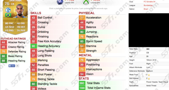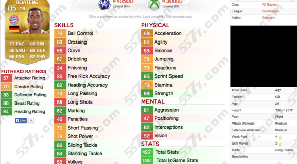 博阿滕比fifa14略有提升,速度上来了。这也让他成为德甲第一中后卫。力量88,速度77,防守83,盯人82. 逆足居然有4星这么高我擦。身高192,完美的中后卫,和诺伊尔的化学反应默契值也是最强的。野兽数值86.