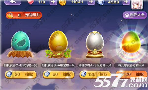 160钻抽取的宠物蛋,可以随机获得A~S级的宠物一只!