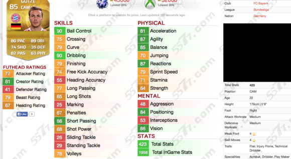 德甲第一前腰,控球90,盘带90,速度80,逆足4.这些数据还算可以,可以保证格策操作起来在场上实战的灵活性。短传86,视野86却算不上顶级前腰,这是也传球总评82的原因,长传只有77太低了。射门74也很平庸,力量64也很普通。总的来说,我对德甲的前腰不太满意,没有一个人可以达到世界一流的水准。