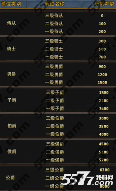 阵营爵位分为7个类别和三个等级,分别为侍从、骑士、男爵、子爵、伯爵、侯爵和公爵,如下图所示,不同的声望值代表不同的爵位。