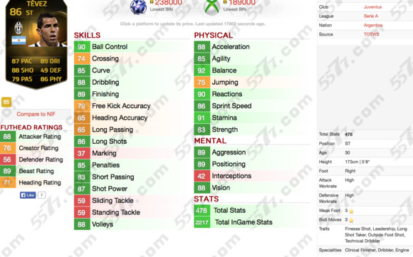 但是弱点是身高只有173,头球威胁小,同时逆足3也是一个射手的不完美的地方。但总的来说特维斯已经是意甲绝对最强的前锋了。野兽数值89.
