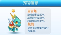 天天酷跑游戏新版本加入了不少的新宠物,如:霹雳狗、吉吉龟、咕咕鸟等等。前面本站整理分享了霹雳狗、咕咕鸟等宠物的属性技能内容,下面在来一起看看吉吉龟好不好吧! 天天酷跑吉吉龟怎么获得: 1、玩家可以直接通过钻石购买来获得,不过游戏中目前宠物还没