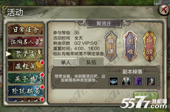 此副本共打三波,首战BOSS马夫人毒蟾除(蜍),名称有个错别字,毒狼!第二波聚贤庄游氏兄弟上阵,游骥,游驹,最后一个BOSS是一个老和尚玄难,有江湖的地方就有和尚,不管和尚在那,都会插一手。对于战力低的游友可以先把小怪全杀了,在慢慢磨BOSS,这个副本没什么难度,且难度等级有等级限制,每提升10级的档次完全不一样,不用当心刷不过。