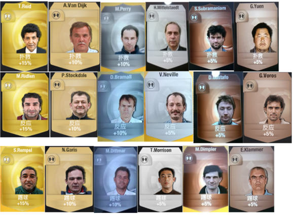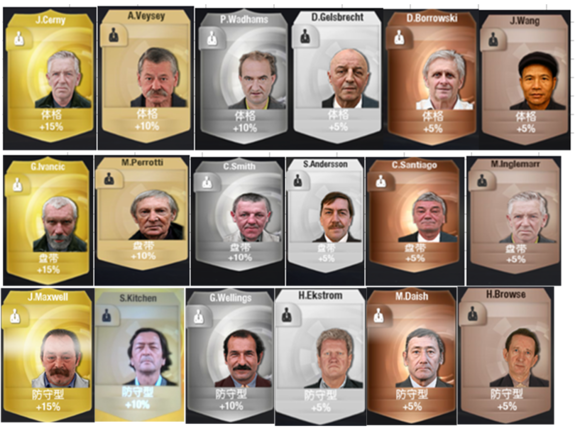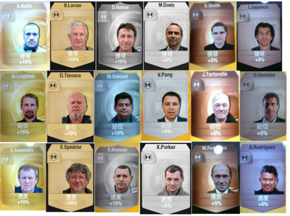 我们可以看到,各类型球队职员从卡片颜色上来分为6种:闪金闪银闪铜(分别加成15% 10% 5%) 普金普银普铜(分别加成10% 5% 5%)