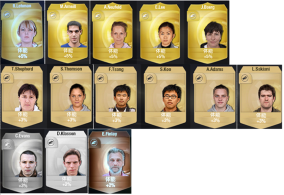 由于体能和合同增益一样,体能加成的球队职员远远可超过50%加成.这里就不把全部的体能职员列举出来了.