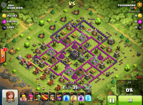 关于打法,主要思路是利用2石头2女巫10法师加皮卡双王突入内圈,爆掉大本。然后利用剩下的1石头1女巫5法师和几个苍蝇去打50%。很聪明有木有