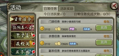(注:发现原来日常任务颜色可以自己刷出橙色紫色,怎么刷其实简单,例如门派任务点接取后如果颜色不是紫色橙色,马上点放弃,不要怕放弃也会计算次数,当时也有这个顾虑,不过一狠心发现木有事。那些就好办一直点接取放弃直到紫色橙色为此。这样我30个任务都是接的紫色橙色时间也花不了多少,在你做日常任务时又把单人副本下了何乐而不为呢);这些任务中强化任务和门派任务是属于最好做的任务了,少于10个小时的玩家可以把每天3次美人、5次抽奖、10次伙伴免费获得次数留着,先到日常任务界面把这3个任务刷新颜色到橙色接取后方可清理日常福利。不管你如何做完30次日常活跃度必须满140点。切记切记