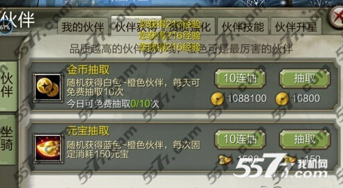 (1)抽奖分为金币抽取和元宝抽取,每天有10次免费的金币抽取,随机获得白色~橙色伙伴;元宝抽取固定一次150元宝,随机获得橙色伙伴,高品质的伙伴获得几率肯定也更高;