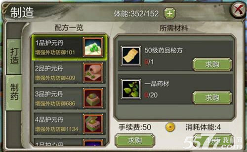 1品护元丹:增强外功防御101,需要50级药品秘方一张,一品药材20颗才可以制造。制造消耗50金币,消耗体能4点。