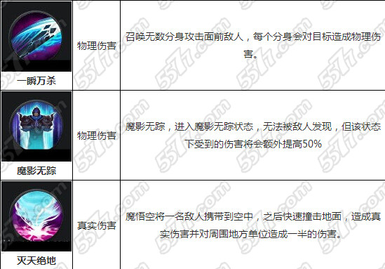 他拥有隐身技能——魔影无踪。这能让他悄悄的接近敌人,并给予对方致命的打击,PVP K头必备神技能!该技能还能躲避来自塔或其他敌人的攻击(群攻技能无法躲避),因此逃跑的时候也非常适合使用该技能。灭天绝地可谓是攻击力和攻击范围超高的技能,当魔悟空携带敌人至空中,不但能躲避地面的伤害,同时还能给予敌群大量的伤害,是个非常暴力凶残的技能!