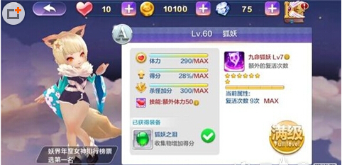 A阶技能:“九命狐妖”,利用狐狸宝珠,获得关卡复活能力,最多可以在单局中复活9次。