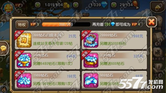 月卡福利:购买月卡就自动升级到了VIP,首购立刻得300元宝。同时,你还可以获得一个四星的孙悟空英雄。
