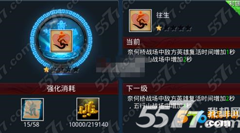 奈何桥战场中敌方英雄复活时间增加1秒,五行山战场中增加2秒。下一级,奈何桥战场中敌方英雄复活时间增加2秒,五行山战场中增加4秒。