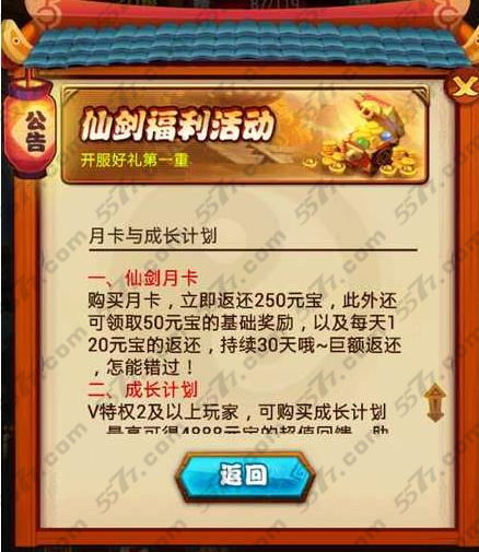 购买月卡,立即返还250元宝,此外还可以领取50元宝的基础奖励,以及每天120元宝的返还,持续30天哦!巨额返还,怎能错过!