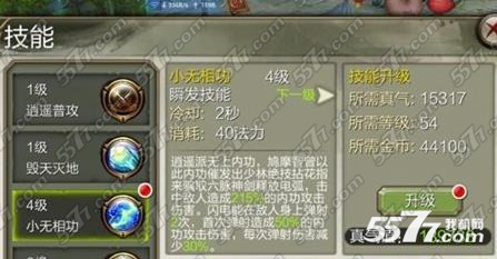 技能主要有消耗法力的单攻技能、群攻技能、控制技能、BUFF技能和消耗战意的必杀技能,除必杀技外,每种技能都可以提升技能等级,满足自身等级要求后,可用真气提升技能等级,真气每隔20分钟根据名人录排名高低发放一次以及挑战名人录时获得。