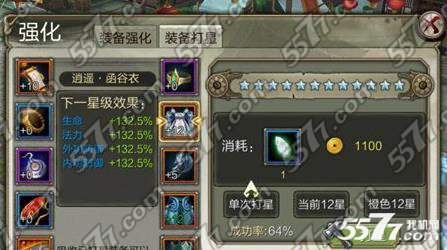 通过打星石升级,有一定的成功概率,失败次数越多下次成功概率越大。按颜色等级越高需要的打星石越多,每阶段分十二星,紫色以下装备不可以打星。