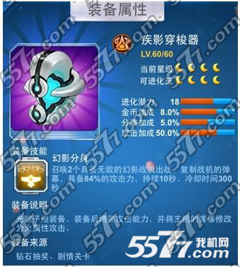 玩家在游戏中如果装备了这个疾影穿梭器,在经典模式还有剧情模式中都是可以召唤两个无敌的幻影战机和你一起战斗的哦!而且还可以复制主战机的弹幕哦!在游戏中有84%的攻击力。技能冷却时间是300秒。