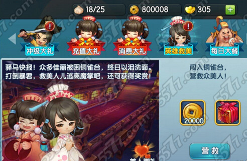 4) 英雄救美,这一活动容易被忽略,其实每天通过救美人也能获得很多的铜币及道具奖励,人品好的话,还可以收到美人的信笺,通过少量玫瑰花就可以领取双倍的移星罗盘,强化石和金宝箱等奖励。