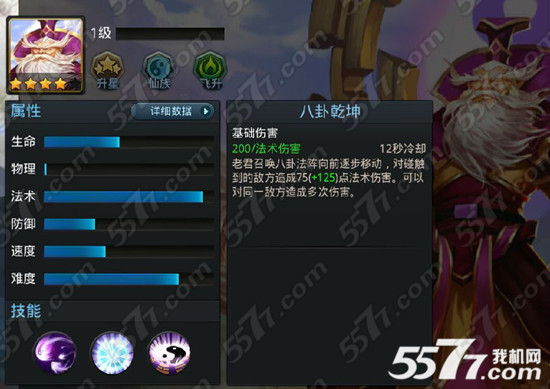 八卦乾坤:12秒冷却,老君召唤八卦法阵向前逐步移动,对碰触到的敌方造成75点法术伤害。可以对同一敌方造成多次伤害。
