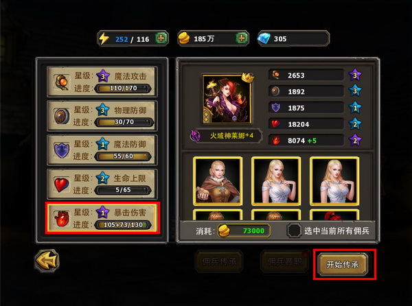 佣兵的提升方式还有一种:佣兵传承。当我们抽取到属性一般或者对已有搭配阵容无关紧要的佣兵时,我们可以充分利用这些佣兵来强化我们的参战佣兵。我们可以对自己的佣兵各项成长属性进行增强。佣兵的每项属性传承都有一个进度条,进度满了才能完成一次属性传承。