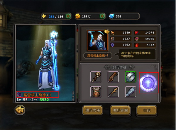 抽到佣兵后,就需要对佣兵进行培养。首先是佣兵的进阶,佣兵可以通过佩戴佣兵装备提升属性,每凑齐6件对应的装备后就可以进行佣兵进阶。不同的装备通过不同的关卡掉落,到后期高级的装备还需要使用低级装备或者相应装备的碎片进行合成。佣兵进阶后会在名字后出现“+1”、“+3”这样的加值,表示进阶次数。
