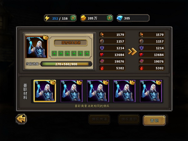 佣兵的提升方式除了佣兵进阶外还有佣兵晋职。在小队的3个佣兵中,相同的佣兵只能出现1个,那么抽到完全相同的佣兵怎么处理呢?佣兵晋职。佣兵的每次晋职都有一个进度条,只有以完全相同的佣兵作为素材才可以推动这个进度,进度满了才能完成一次晋职。