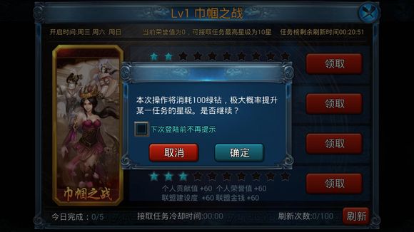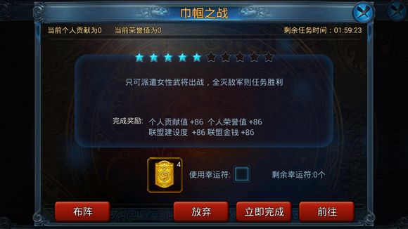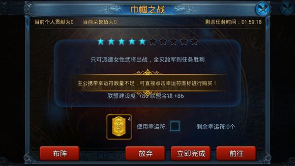 今天是周3只有巾帼,任务条件是“出场将领必须全部女性”。