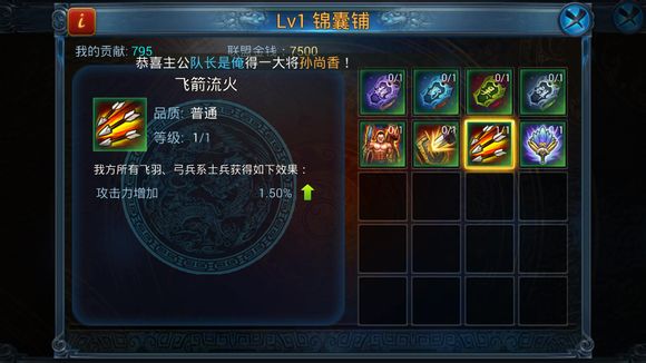 完成任务会获得“个人贡献”,然后可以去“锦囊铺”学习“特技”以增强自身实力,在“布阵”会多出一个大大的 “ + ” 号,点一下就可以装备上自己学习的技能了。
