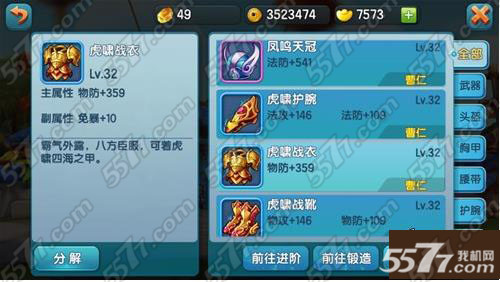 装备分解可以获取装备进阶所需要的一些材料、强化石和铜钱等,如果有不用的装备可以考虑拿去分解了而不要拿去直接卖商店。