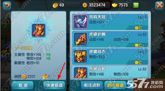 锻造需要消耗一定数量强化石和和铜钱,如果强化石多还可以进行快速锻造省去时间。